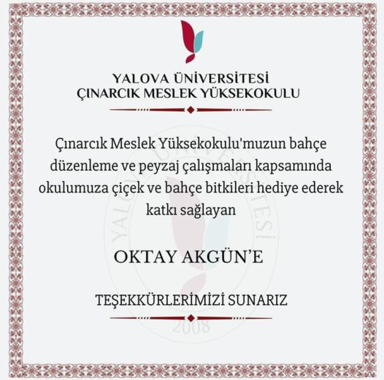 İş insanı Akgün’e verilen plakette, “Yalova Üniversitesi Çınarcık Meslek Yüksek Okulu bahçe düzenleme ve peyzaj çalışmaları kapsamında okulumuza çiçek ve bahçe bitkileri hediye ederek katkı sağlayan Oktay Akgün’e teşekkür ederiz.” ifadeleri yer aldı.