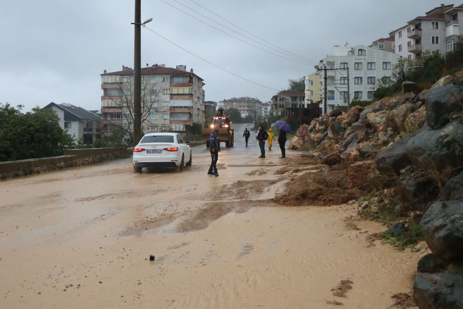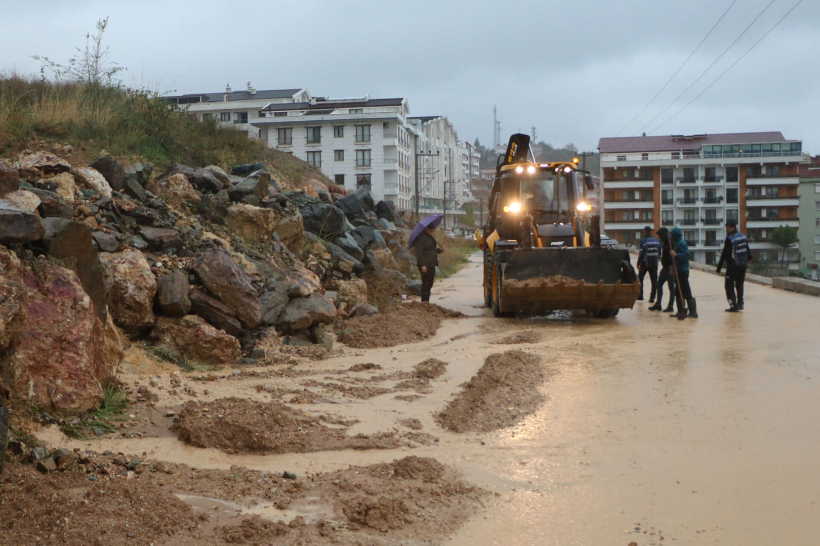 Son günlerde aralıksız yağan yağmur sonrası Poyraz Caddesi’nde kayan bölgede çalışmalarını sürdüren belediye ekipleri, yola doğru kayan toprağı alarak yolu genişletiyorlar.