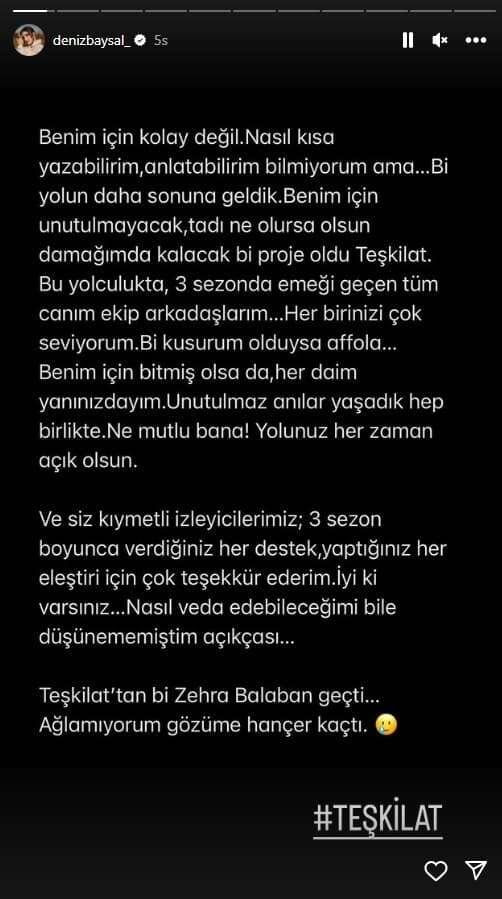 Deniz Baysal bu haberi ilk kendi sosyal medya hesabı üzerinden paylaşarak sevenlerine duyurdu. Diziden ayrıldığının hüznünü anlatan başarılı oyuncu artık Teşkilat dizisinde olmayacak.