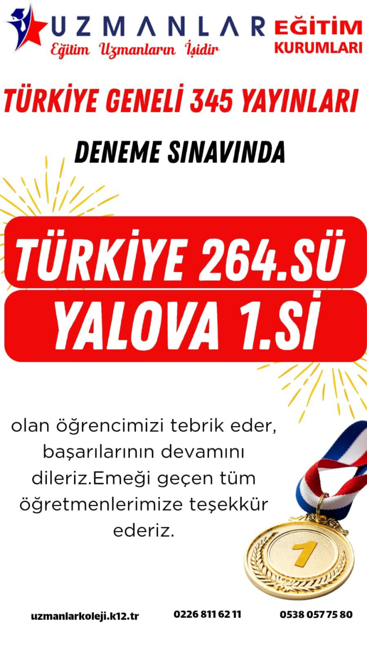 Ayrıca bir öğrenci, Türkiye genelinde 264. olarak aynı zamanda Yalova 1.si olma başarısını gösterdi. Bu sonuçlarla Uzmanlar Koleji, şehir genelindeki başarı grafiğini önemli ölçüde yükseltti.