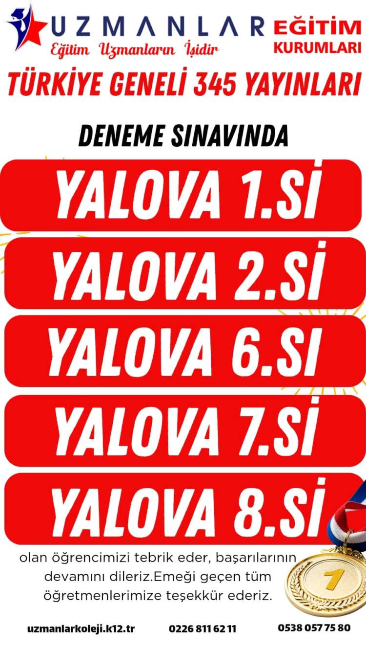 Uzmanlar Koleji, Türkiye geneli yapılan 345 Yayınları Deneme Sınavı sonuçlarında elde ettiği dikkat çekici başarılarla eğitimdeki iddiasını bir kez daha ortaya koydu. Kurum, hem Türkiye sıralamasında hem de Yalova genelinde aldığı derecelerle büyük takdir topladı.