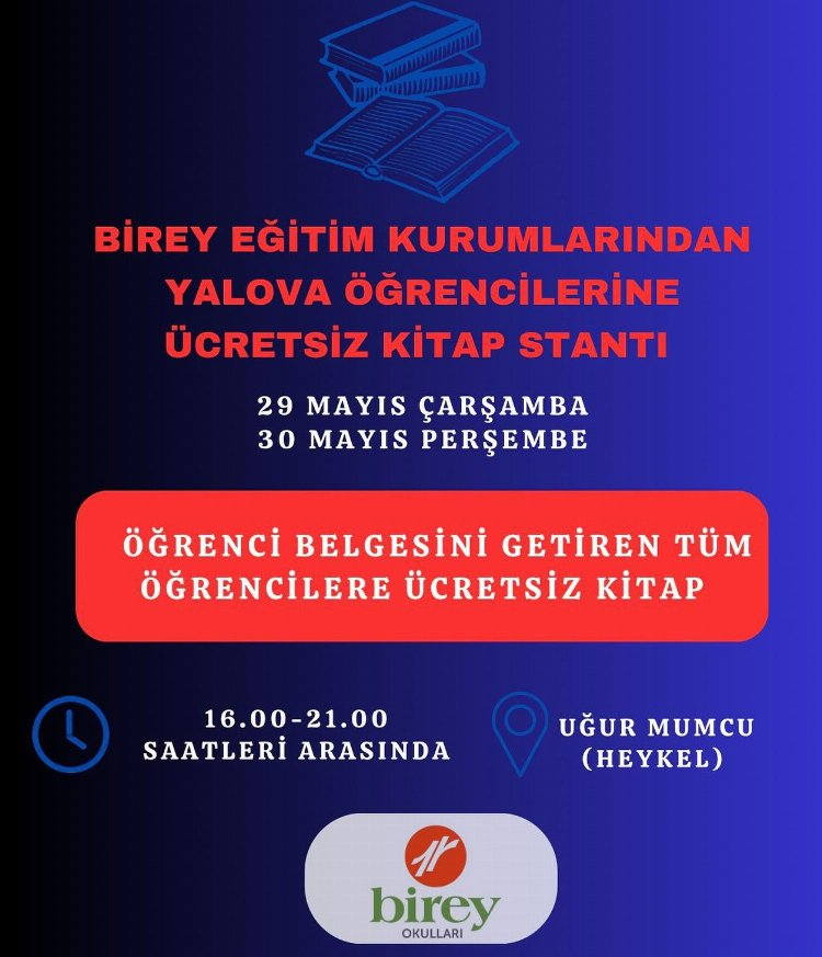 “Geleneksel Türk Kağıt Üretimi Projesi, Gençlik Şenlikleri, Bilim Şenliği, sergiler, deneme sınavları, motivasyon piknikleri, şehir dışı gezileri ve kitap değişim etkinlikleri gibi çalışmalarla öğrencilerini destekleyen ve geliştiren Birey Eğitim Kurumları, Yalova öğrencileri için ücretsiz kitap standı kuracağını duyurdu. 29 Mayıs Çarşamba günü ve 30 Mayıs Perşembe günü 15 Temmuz Demokrasi ve Cumhuriyet Meydanına kurulacak olan stant, saat 16.00’dan 21.00’a kadar tüm öğrencilere hizmet verecek. Yalova’da ilk defa yapılan etkinlikte öğrenci belgesini getiren tüm öğrenciler stantta yer alan kitaplardan istediklerini ücretsiz olarak alabilecek.