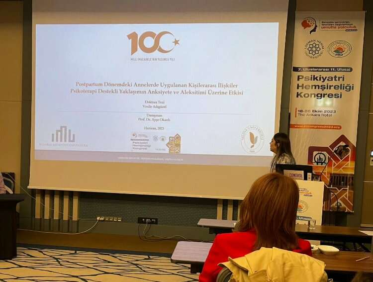 Psikiyatri Hemşireliği Derneği ve Uluslararası Kongrenin de Yönetim Kurulu Üyesi olan Dr. Öğretim Üyesi Vesile Adıgüzel, "Postpartum Dönemdeki Annelerde Uygulanan Kişilerarası İlişkiler Psikoterapi Destekli Yaklaşımın Anksiyete ve Aleksitimi Üzerine Etkisi" çalışmasını sözel sunum olarak gerçekleştirdi.