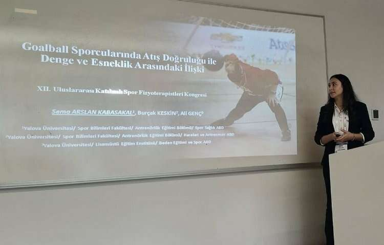 Yalova Üniversitesi’nin Spor Bilimleri Fakültesi öğretim elemanlarından olan Araştırma Görevlisi Dr. Sema Arslan Kabasakal fakülteyi temsilen katılım sağlamış olduğu kongrede bildiri sunumunu gerçekleştirmek üzere kürsüye çıkarak ‘’Goalball Sporcularında Atış Doğruluğu ile Denge ve Esneklik arasındaki İlişki’’ adlı sunumunu gerçekleştirdi.