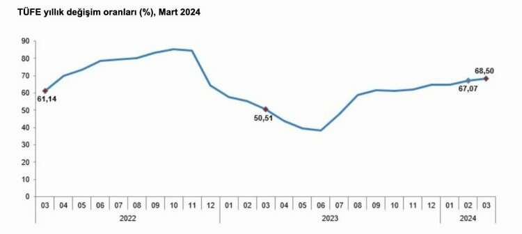 TÜFE'deki değişim 2024 yılı Mart ayında; 2023 Mart ayına göre yüzde 3,16, bir önceki yılın Aralık ayına göre ise yüzde 15,06, bir önceki yılın aynı ayına göre yüzde 68,50 olarak ve on iki aylık ortalamalara göre yüzde ise 57,50 olarak gerçekleşti.