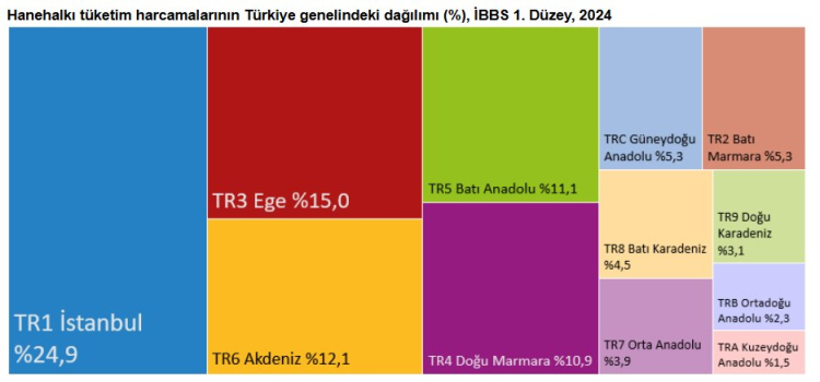 Türkiye İstatistik Kurumu (TÜİK), 2024 yılında Türkiye'deki hanehalkı tüketim harcamalarının yüzde 24,9'unun İstanbul bölgesinde gerçekleştiğini açıkladı. İkinci sırada yüzde 8,3 ile Ankara yer aldı. Ankara’yı yüzde 6,4 ile İzmir, yüzde 5,9 ile Kocaeli, Sakarya, Düzce, Bolu, Yalova bölgeleri izledi.