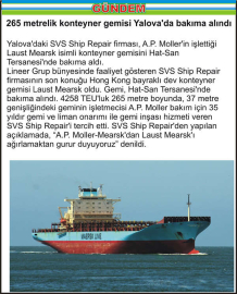 Lineer Grup bünyesinde faaliyet gösteren SVS Ship Repair firmasının son konuğu Hong Kong bayraklı dev konteyner gemisi Laust Mearsk oldu. Gemi, Hat-San Tersanesi’nde bakıma alındı. 4258 TEU’luk 265 metre boyunda, 37 metre genişliğindeki geminin işletmecisi A.P. Moller bakım için 35 yıldır gemi ve liman onarımı ile gemi inşası hizmeti veren SVS Ship Repair’i tercih etti. SVS Ship Repair’den yapılan açıklamada, “A.P. Moller-Mearsk’dan Laust Mearsk’ı ağırlamaktan gurur duyuyoruz” denildi.