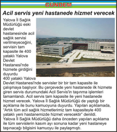 Yalova İl Sağlık Müdürlüğü eski devlet hastanesinde acil sağlık servisi verilmeyeceğini, servisin tam kapasite ile 400 yataklı Yalova Devlet Hastanesi’nde hizmete girdiğini duyurdu