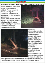Altınova’daşiddetini arttıran kuvvetli fırtına 7 ayrı noktada ağaçların devrilmesine neden oldu.İlçede ağaçların devrilmesi nedeniyle oluşabilecek tehlikeli durumların önlenmesine yönelik kritik noktalarda elektik kesintisine gidildi. Altınova Belediyesi İtfaiye Amirliği ile Altınova Belediyesi Fen İşleri Müdürlüğü Garaj Amirliği ekipleri ilçe genelinde teyakkuza geçti.Vatandaşlardan kuvvetli rüzgâr ve fırtınanın oluşturabileceği çatı uçması, ağaç ve direk devrilmesi, soba ve baca gazı kaynaklı zehirlenmeler ve ulaşımda aksamalar gibi olumsuzluklara karşı dikkatli ve tedbirli olunması istendi.