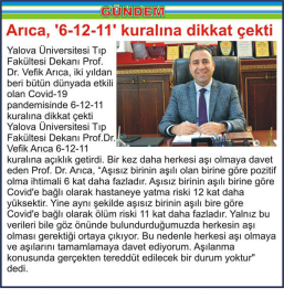 Yalova Üniversitesi Tıp Fakültesi Dekanı Prof.Dr. Vefik Arıca 6-12-11 kuralına açıklık getirdi. Bir kez daha herkesi aşı olmaya davet eden Prof. Dr. Arıca, “Aşısız birinin aşılı olan birine göre pozitif olma ihtimali 6 kat daha fazladır. Aşısız birinin aşılı birine göre Covid’e bağlı olarak hastaneye yatma riski 12 kat daha yüksektir. Yine aynı şekilde aşısız birinin aşılı bire göre Covid’e bağlı olarak ölüm riski 11 kat daha fazladır. Yalnız bu verileri bile göz önünde bulundurduğumuzda herkesin aşı olması gerektiği ortaya çıkıyor. Bu nedenle herkesi aşı olmaya ve aşılarını tamamlamaya davet ediyorum. Aşılanma konusunda gerçekten tereddüt edilecek bir durum yoktur" dedi.