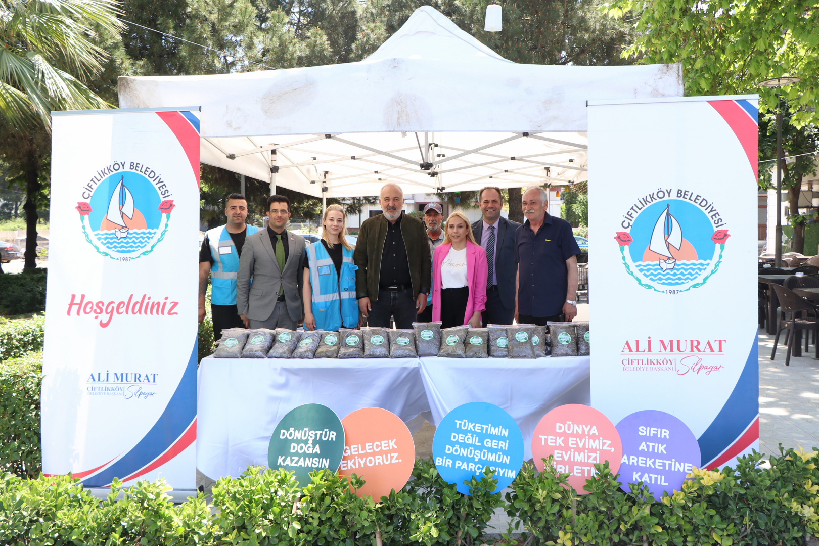 Çiftlikköy Belediye Başkanı Ali Murat Silpagar, 5 Haziran Dünya Çevre Günü’nde başlayan Çevre Haftası etkinlikleri kapsamında Engelsiz Kafe önünde kurulan stantta Çiftlikköylülere organik toprak hediye etti.