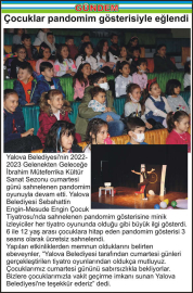 Yalova Belediyesi’nin 2022-2023 Gelenekten Geleceğe İbrahim Müteferrika Kültür Sanat Sezonu cumartesi günü sahnelenen pandomim oyunuyla devam etti. Yalova Belediyesi Sebahattin Engin-Mesude Engin Çocuk Tiyatrosu'nda sahnelenen pandomim gösterisine minik izleyiciler her tiyatro oyununda olduğu gibi büyük ilgi gösterdi. 6 ile 12 yaş arası çocuklara hitap eden pandomim gösterisi 3 seans olarak ücretsiz sahnelendi.