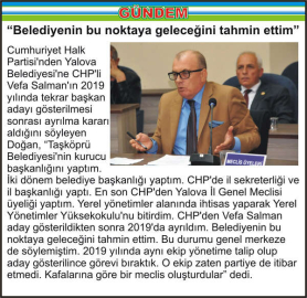 Cumhuriyet Halk Partisi’nden Yalova Belediyesi’ne CHP’li Vefa Salman’ın 2019 yılında tekrar başkan adayı gösterilmesi sonrası ayrılma kararı aldığını söyleyen Doğan, “Taşköprü Belediyesi’nin kurucu başkanlığını yaptım. İki dönem belediye başkanlığı yaptım