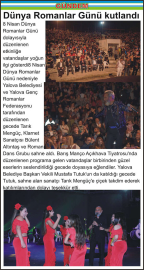 8 Nisan Dünya Romanlar Günü dolayısıyla düzenlenen etkinliğe vatandaşlar yoğun ilgi gösterdi8 Nisan Dünya Romanlar Günü nedeniyle Yalova Belediyesi ve Yalova Genç Romanlar Federasyonu tarafından düzenlenen gecede Tarık Mengüç, Klarnet Sanatçısı Bülent Altıntaş ve Roman Dans Grubu sahne aldı. Barış Manço Açıkhava Tiyatrosu’nda düzenlenen programa gelen vatandaşlar birbirinden güzel eserlerin seslendirildiği gecede doyasıya eğlendiler. Yalova Belediye Başkan Vekili Mustafa Tutuk’un da katıldığı gecede Tutuk, sahne alan sanatçı Tarık Mengüç’e çiçek takdim ederek katılımlarından dolayı teşekkür etti.