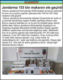 Yalova Jandarma Komutanlığı KOM ekipleri Çınarcık ilçesinde bir eve ve iş yerine yapılan operasyonda 153 bin 257 adet makaron ele geçirdi