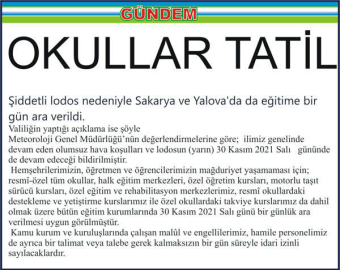 Hemşehrilerimizin, öğretmen ve öğrencilerimizin mağduriyet yaşamaması için; resmî-özel tüm okullar, halk eğitim merkezleri, özel öğretim kursları, motorlu taşıt sürücü kursları, özel eğitim ve rehabilitasyon merkezlerimiz, resmî okullardaki destekleme ve yetiştirme kurslarımız ile özel okullardaki takviye kurslarımız da dahil olmak üzere bütün eğitim kurumlarında 30 Kasım 2021 Salı günü bir günlük ara verilmesi uygun görülmüştür.