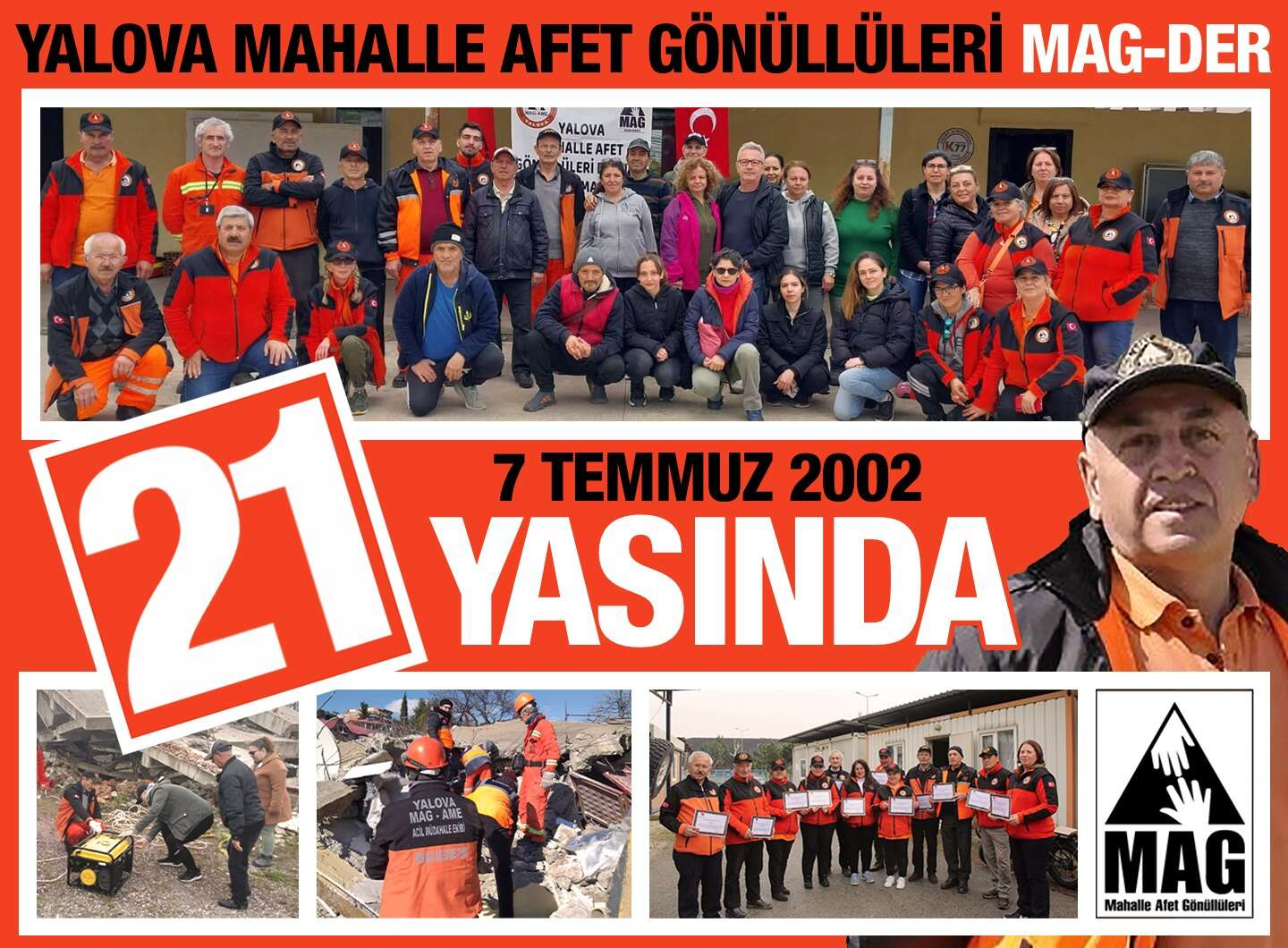 Yalova Mahalle Afet Gönüllüleri Derneği (MAG-DER) 21. kuruluş yıl dönümünü kutluyor. Dernek, 2000 yılında kurulan Mahalle Afet Gönüllüleri (MAG) yapılanmasının Yalova’daki temsilcisi olarak afetlere hazırlık, afet bilincini artırma ve afet durumunda ilk müdahale konularında faaliyet gösteriyor.