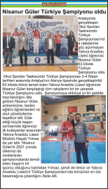 Antalya’da gerçekleşen Okul Sporları Taekwondo Türkiye Şampiyonası’nda rakiplerine göz açtırmayan Yalova Anadolu Lisesi öğrencisi Nisanur Güler 63 kiloda Türkiye Şampiyonu oldu
