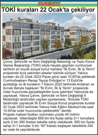 Çevre, Şehircilik ve İklim Değişikliği Bakanlığı ve Toplu Konut İdaresi Başkanlığı (TOKİ) eliyle hayata geçirilen cumhuriyet tarihinin en büyük sosyal konut hamlesi “İlk Evim, İlk İş Yerim” projesinde kura çekimleri etaplar halinde sürüyor. Yalova kuraları da 22 Ocak 2023 Pazar günü saat 10.00’da çekilecek