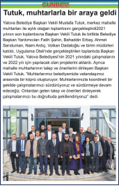 Yalova Belediye Başkan Vekili Mustafa Tutuk, merkez mahalle muhtarları ile aylık olağan toplantısını gerçekleştirdi2021 yılının son toplantısına Başkan Vekili Tutuk ile birlikte Belediye Başkan Yardımcıları Fatih Şahin, Bahaddin Erbay, Ahmet Sarıduman, Naim Ardıç, Volkan Dadaloğlu ve birim müdürleri katıldı. Uygulama Oteli’nde gerçekleştirilen toplantıda Başkan Vekili Tutuk, Yalova Belediyesi'nin 2021 yılındaki çalışmalarını ve 2022 yılı için yapılacak olan projelerini aktardı. Ayrıca mahalle muhtarlarının talep ve önerilerini dinleyen Başkan Vekili Tutuk, “Muhtarlarımız belediyemizle vatandaşımız arasında bir köprü oluşturuyor. Muhtarlarımızla koordineli bir şekilde çalışmalarımızı sürdürüyoruz ve sürdürmeye devam edeceğiz. Onlardan gelen talep ve önerileri dinleyerek çalışmalarımızı bu doğrultuda şekillendiriyoruz” dedi.