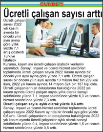 Ücretli çalışan sayısı 2022 yılı kasım ayında bir önceki yılın aynı ayına göre yıllık yüzde 7,1 artış gösterdi