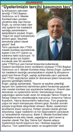 Üyelerin tercihlerine önem verdiklerini söyleyen YTSO Başkan Yardımcısı ve 5. Meslek Komitesi Adayı Kenan Engin, üyelerin hür iradelerini sandığa yansıtacaklarını söyledi.İş dünyasının güçlü ismi Kenan Engin, yaptığı açıklamada yarın yapılacak olan YTSO seçimlerinin adeta bir demokrasi şöleni havasında geçmesi gerektiğini bildirdi.
