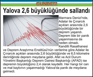 Kandilli Rasathanesi ve Deprem Araştırma Enstitüsü'nün verilerine göre Adalar ile Çınarcık açıkları arasında 2,6 büyüklüğünde ve 6,5 kilometre derinliğinde deprem meydana geldi. Afet ve Acil Durum Yönetimi Başkanlığı Deprem Dairesi Başkanlığı (AFAD) ise depremin büyüklüğünü 2,4 olarak kaydetti. Her hangi bir can ve mal kaybının yaşanmadığı Yalova’da panik de meydana gelmedi.