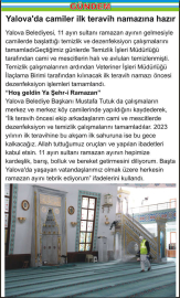 Yalova Belediye Başkanı Mustafa Tutuk da çalışmaların merkez ve merkez köy camilerinde yapıldığını kaydederek, “İlk teravih öncesi ekip arkadaşlarım cami ve mescitlerde dezenfeksiyon ve temizlik çalışmalarını tamamladılar. 2023 yılının ilk teravihine bu akşam ilk sahuruna ise bu gece kalkacağız. Allah tuttuğumuz oruçları ve yapılan ibadetleri kabul etsin. 11 ayın sultanı ramazan ayının hepimize kardeşlik, barış, bolluk ve bereket getirmesini diliyorum. Başta Yalova’da yaşayan vatandaşlarımız olmak üzere herkesin ramazan ayını tebrik ediyorum” ifadelerini kullandı.