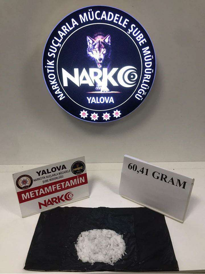 Yalova İl Emniyet Müdürlüğü Narkotik Suçlarla Mücadele Şube Müdürlüğü ekipleri tarafından 08.06.2023 günü yapılan çalışmalarda, çevre illerden temin ettikleri uyuşturucu maddeleri il içerisinde üst torbacı tabir edilen şahıslar ile sokak satıcılarına ulaştırmaya çalışan F.T., E.B. ve Y.A. isimli şüphelilerin içerisinde bulunduğu araç Altınova-Yalova karayolu üzerinde durduruldu. Şüpheliler yakalanarak etkisiz hale getirildi. Ekipler tarafından yapılan araç ve üst aramalarında F.T. ile E.B. isimli şahıslardan 60.41 gram metamfetamin maddesi, 50 adet captagon sentetik hap ele geçirildi. Genişletilen soruşturma kapsamında şüpheli Y.A. isimli şahsın ikametinde narkotik maddeler arama köpeği Zeytin eşliğinde yapılan aramada ise 192 adet captagon sentetik hap, 64 adet sentetik ecza grubu hap ve 1 adet hassas terazi ele geçirildi.