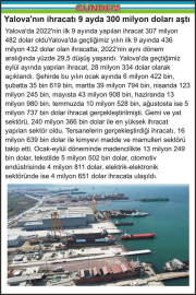 Yalova’da 2022’nin ilk 9 ayında yapılan ihracat 307 milyon 482 dolar olduYalova'da geçtiğimiz yılın ilk 9 ayında 436 milyon 432 dolar olan ihracatta, 2022’nin aynı dönem aralığında yüzde 29,5 düşüş yaşandı. Yalova’da geçtiğimiz eylül ayında yapılan ihracat, 28 milyon 334 dolar olarak açıklandı. Şehirde bu yılın ocak ayında 6 milyon 422 bin, şubatta 35 bin 619 bin, martta 39 milyon 794 bin, nisanda 123 milyon 245 bin, mayısta 43 milyon 908 bin, haziranda 13 milyon 980 bin, temmuzda 10 milyon 528 bin, ağustosta ise 5 milyon 737 bin dolar ihracat gerçekleştirilmişti. Gemi ve yat sektörü, 240 milyon 366 bin dolar ile en yüksek ihracat yapılan sektör oldu. Tersanelerin gerçekleştirdiği ihracatı, 16 milyon 639 bin dolar ile kimyevi madde ve mamulleri sektörü takip etti. Ocak-eylül döneminde madencilikte 13 milyon 249 bin dolar, tekstilde 5 milyon 502 bin dolar, otomotiv endüstrisinde 4 milyon 811 dolar, elektrik-elektronik sektöründe ise 4 milyon 651 dolar ihracata ulaşıldı.