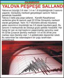 Yalova en büyüğü 3.6 olan 1.4 ve 1.6 büyüklüğünde 3 sarsıntı yaşandı. Güneyköy merkezli gerçekleşen sarsıntı Yalova genelinde hissedildi.