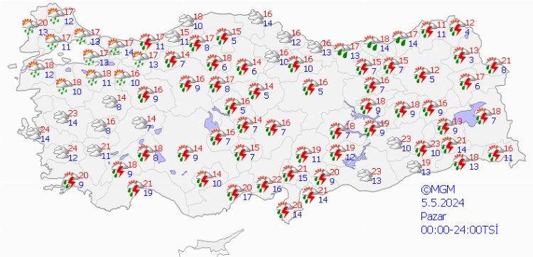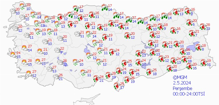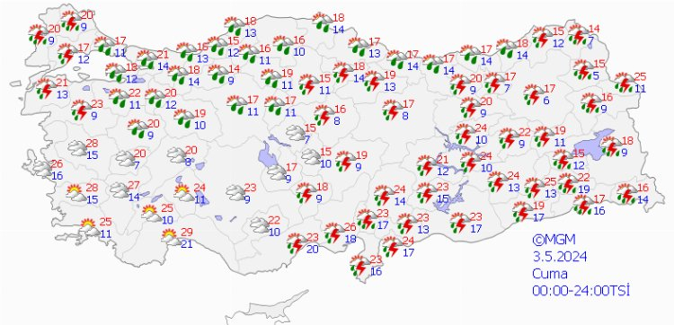 Meteoroloji Genel Müdürlüğü son hava tahmin raporuna göre 34 il için sarı kodlu uyarı verdi. Marmara, Karadeniz, Akdeniz'in iç kesimleri, İç Anadolu'nun güneyi ve doğusu, Doğu Anadolu ve Güneydoğu Anadolu bölgeleri gök gürültülü sağanak yağışlı olması bekleniyor. Vatandaşların sel ve su baskınlarına karşı dikkatli olması istendi.