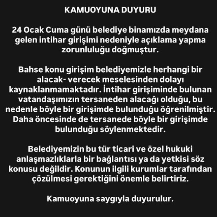 Öte yandan Altınova Belediyesi tarafından kamuoyuna bilgilendirme metni yayınlandı. Belediye sosyal medya hesabından, "24 Ocak Cuma günü Belediye binamızda meydana gelen intihar girişimi nedeniyle açıklama yapma zorunluluğu doğmuştur. Bahse konu girişim belediyemizle herhangi bir alacak– verecek meselesinden dolayı kaynaklanmamıştır. İntihar girişiminde bulunan vatandaşımızın tersaneden alacağı olduğu, bu nedenle böyle bir intihar girişiminde bulunduğu öğrenilmiştir. Daha öncesinde de tersanede böyle bir girişimde bulunduğu söylenmektedir. Belediyemizin bu tür ticari ve hukuki anlaşmazlıklarla bir bağlantısı ya da yetkisi söz konusu değildir. Konunun ilgili kurumlar tarafından çözülmesi gerektiğini önemle belirtiriz. Kamuoyuna duyurulur.” paylaşımında bulundu.