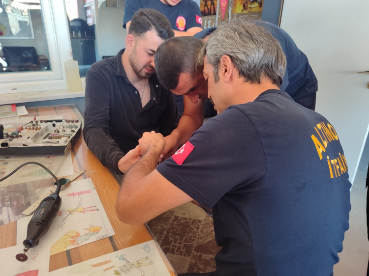Alınan bilgilere göre, Yalova’nın Altınova İlçesinde, parmağına yüzük sıkışan Veysi B.’nin Altınova Belediyesi İtfaiye Amirliğine giderek yardım istediği öğrenildi. Durum üzerine itfaiye ekipleri hızlıca harekete geçerek, yüzüğü çıkarmak için çalışma başlattı. Ekipler, sıkışan yüzüğü çıkarmak için çeşitli yöntemleri değerlendirdi ve en etkili çözüm olarak spiralle kesme yöntemini tercih etti. Bu özel ekipman kullanılarak yüzüğün parmağa zarar vermeden kesilmesi sağlandı. İtfaiye ekiplerinin titiz ve dikkatli çalışması sonucunda yüzük kısa süre içinde başarıyla çıkarıldı.