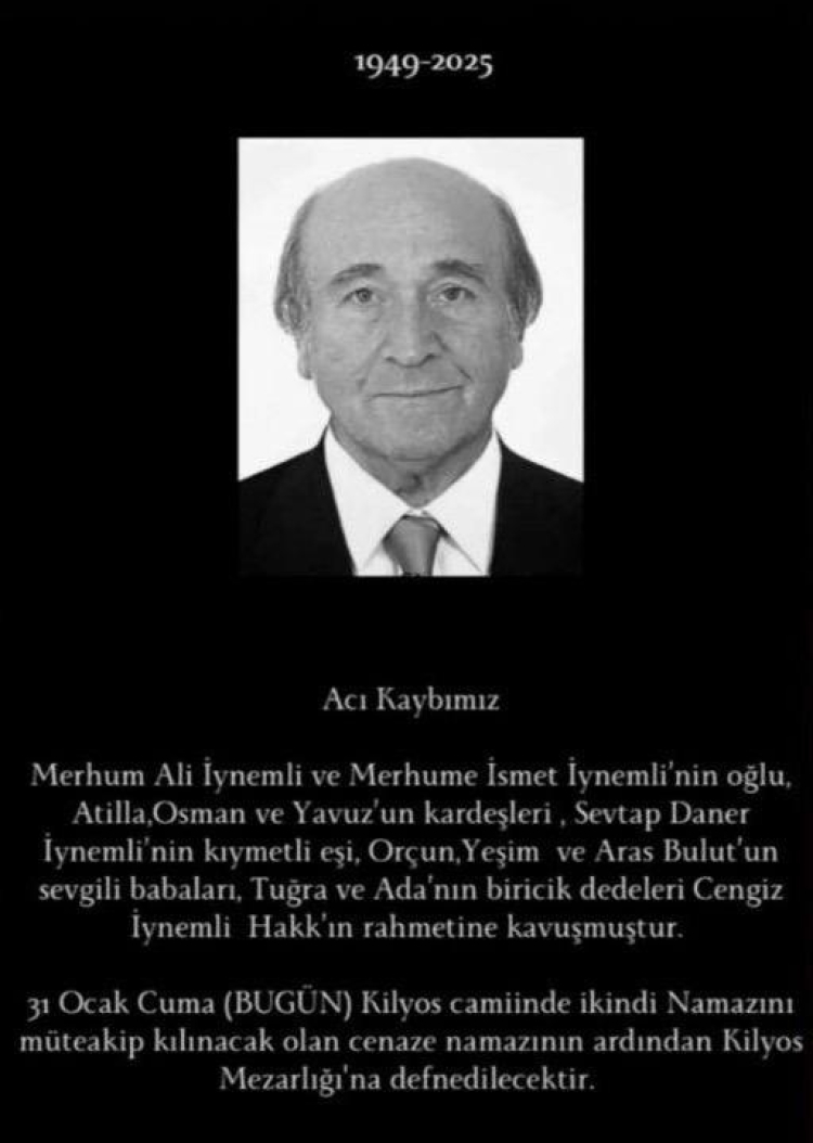 Verilen cenaze ilanında “Merhum Ali İynemli ve Merhume İsmet İynemli’nin oğlu, Atilla, Osman ve Yavuz’un kardeşleri, Sevtap Daner İynemli’nin kıymetli eşi, Orçun, Yeşim ve Aras Bulut’un sevgili babaları, Tuğra ve Ada’nın biricik dedeleri Cengiz İynemli Hakk’ın rahmetine kavuşmuştur” cümleleri yer aldı. Cenaze namazı Kilyos Camii’nde kılındıktan sonra cenaze Kilyos Mezarlığına uğurlandı.
