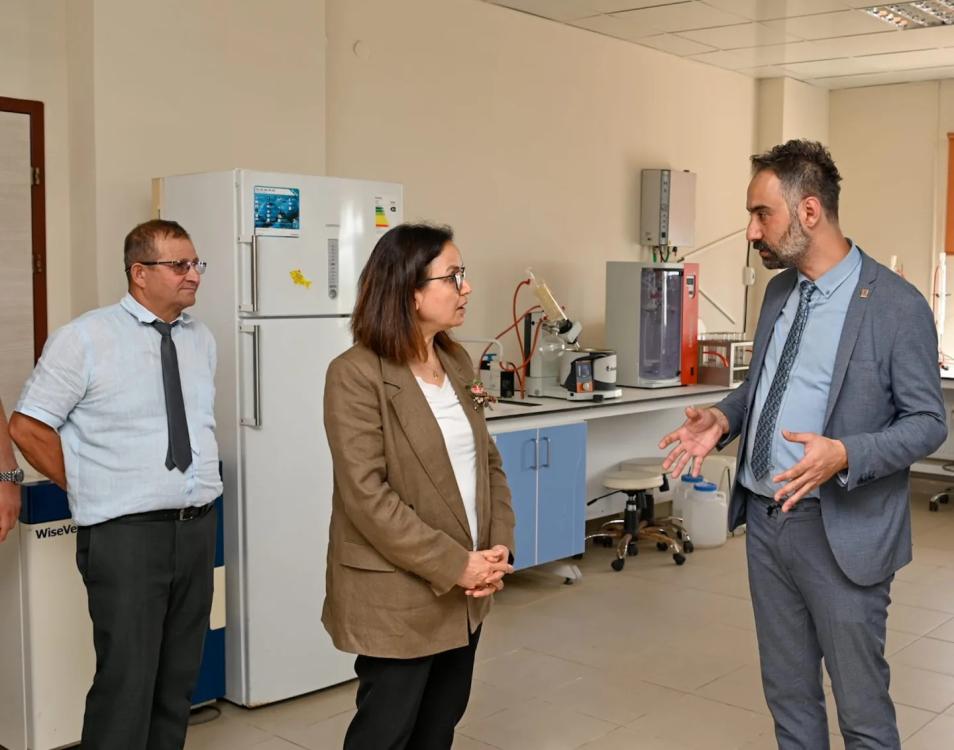 Vali Hülya Kaya, Armutlu Kaymakamı Yusuf Melikşah Aydın, Belediye Başkanı Cengiz Arslan ve Armutlu Meslek Yüksekokulu Müdürü Dr. Öğretim Üyesi Serhan Mantoğlu ile birlikte Armutlu Meslek Yüksekokulu uygulama laboratuvarında incelemelerde bulundu.