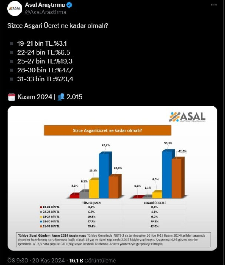 ASAL Araştırma şirketinden bu kez asgari ücret anketi geldi. Milyonlarca vatandaşın gözü kulağı aralık ayı sonunda belirlenecek olan asgari ücret zammında. ASAL Araştırma, 9-17 Kasım tarihleri arasında 26 ilde 2 bin 15 kişi ile gerçekleştirdiği anketinde katılımcılara “sizce asgari ücret ne kadar olmalı?” diye sordu.