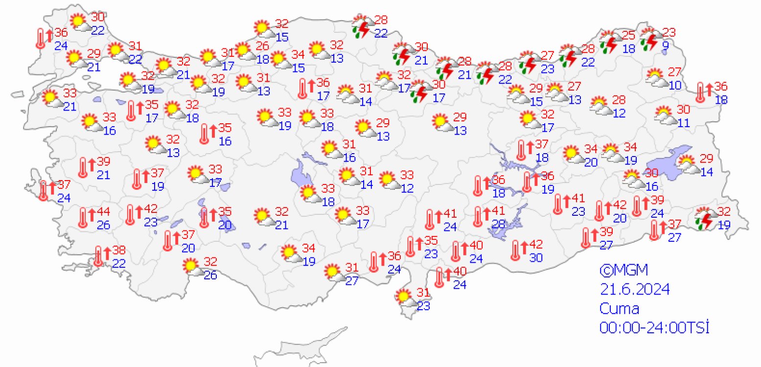 Meteoroloji’nin hava tahmin raporuna göre, yurdun Orta ve Doğu Karadeniz kıyıları, Sinop, Artvin ve Ardahan çevreleri, Denizli’nin güney, Muğla’nın iç kesimleri ile Antalya’nın batısının iç kesimlerinin yerel olmak üzere sağanak ve gök gürültülü sağanak yağışlı, diğer yerlerin az bulutlu ve açık geçeceği tahmin ediliyor.