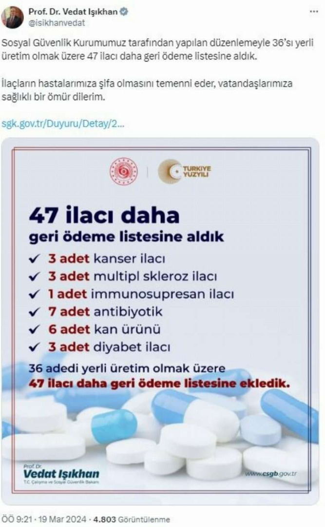 Sosyal medya üzerinden konuyla ilgili açıklamada bulunan Bakan Vedat Işıkhan "Sosyal Güvenlik Kurumumuz tarafından yapılan düzenlemeyle 36'sı yerli üretim olmak üzere 47 ilacı daha geri ödeme listesine aldık. İlaçların hastalarımıza şifa olmasını temenni eder, vatandaşlarımıza sağlıklı bir ömür dilerim." ifadelerini kullandı.