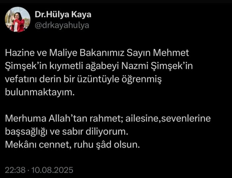 Yalova Valisi Dr. Hülya Kaya da sosyal medya hesabından yaptığı paylaşımda taziye mesajı yayımlayarak şu ifadelere yer verdi, “Hazine ve Maliye Bakanımız Sayın Mehmet Şimşek’in kıymetli ağabeyi Nazmi Şimşek’in vefatını derin bir üzüntüyle öğrenmiş bulunmaktayım. Merhuma Allah’tan rahmet; ailesine, sevenlerine başsağlığı ve sabır diliyorum. Mekânı cennet, ruhu şâd olsun.”