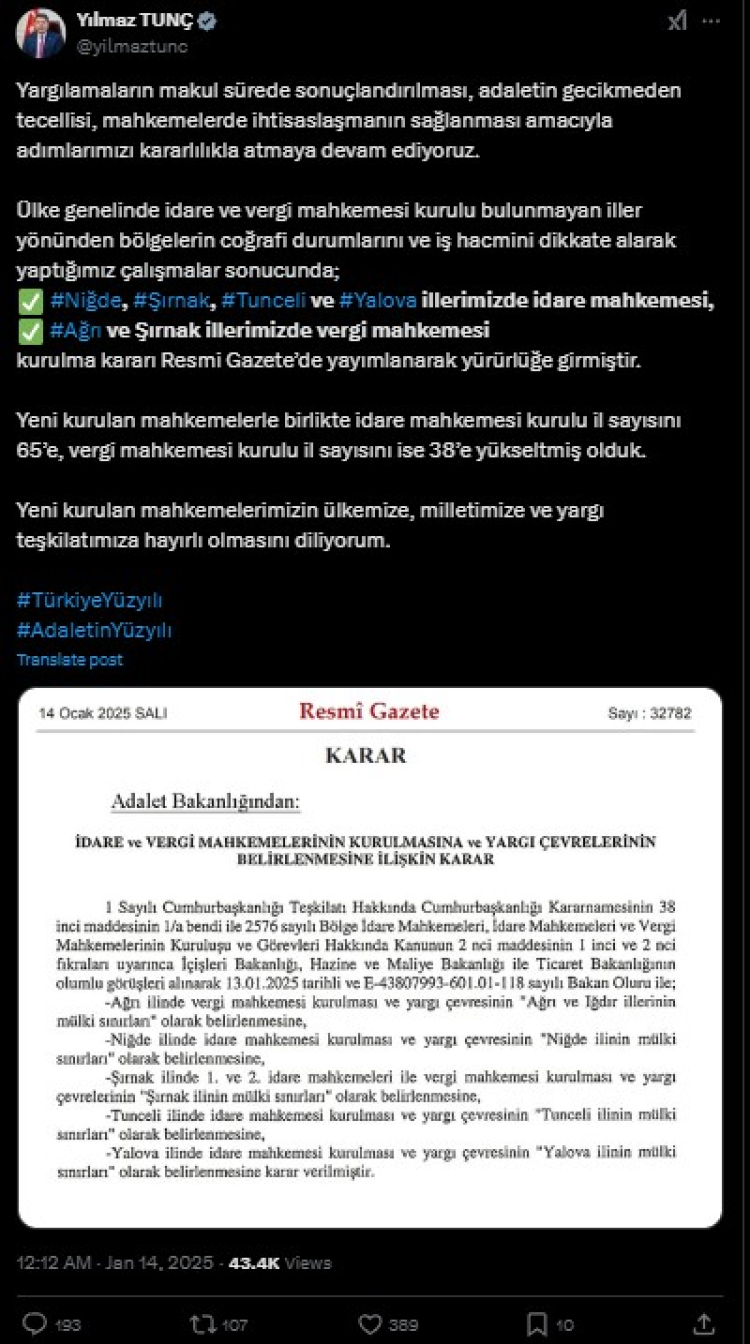 Kararı sosyal medya hesabından duyuran Adalet Bakanı Yılmaz Tunç da “Yargılamaların makul sürede sonuçlandırılması, adaletin gecikmeden tecellisi, mahkemelerde ihtisaslaşmanın sağlanması amacıyla adımlarımızı kararlılıkla atmaya devam ediyoruz. Ülke genelinde idare ve vergi mahkemesi kurulu bulunmayan iller yönünden bölgelerin coğrafi durumlarını ve iş hacmini dikkate alarak yaptığımız çalışmalar sonucunda Niğde, Şırnak, Tunceli ve Yalova illerimizde idare mahkemesi, Ağrı ve Şırnak illerimizde vergi mahkemesi kurulma kararı Resmi Gazete’de yayımlanarak yürürlüğe girmiştir. Yeni kurulan mahkemelerle birlikte idare mahkemesi kurulu il sayısını 65’e, vergi mahkemesi kurulu il sayısını ise 38’e yükseltmiş olduk. Yeni kurulan mahkemelerimizin ülkemize, milletimize ve yargı teşkilatımıza hayırlı olmasını diliyorum” ifadelerini kullandı.