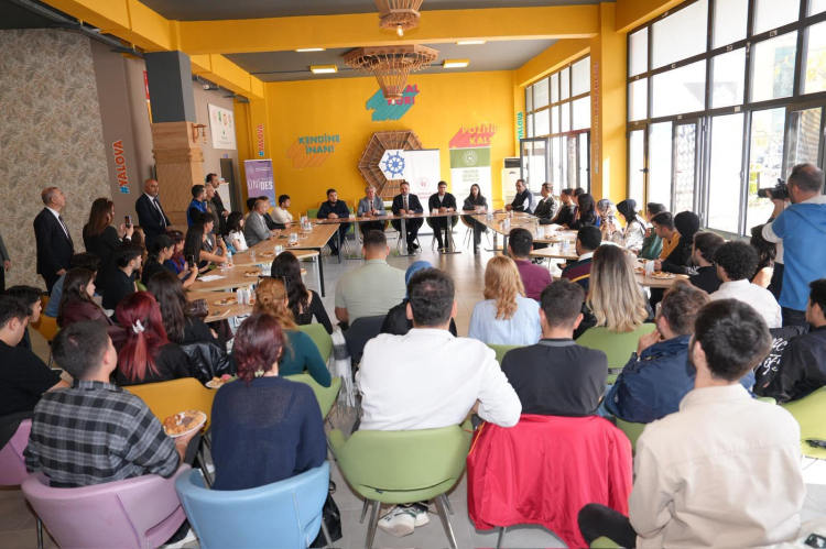 Ziyaret kapsamında Genç Ofis’te öğrencilerle buluşan Bakan Yardımcısı Eminoğlu ve Rektör Bahçekapılı, gençlerin görüş ve taleplerini dinledi.