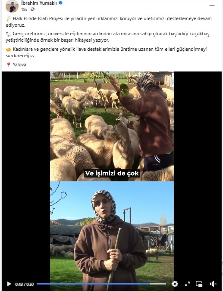 Tarım ve Orman Bakanı İbrahim Yumaklı, yıllardın sürdürdüğü muhasebecilik mesleğini bırakarak Yalova’da besicilik yapmaya başlayan Deniz Karataş’ı sosyal medya hesabında paylaştı. Bakan Yumaklı, Deniz Karataş için “Genç üreticimiz, üniversite eğitiminin ardından ata mirasına sahip çıkarak başladığı küçükbaş yetiştiriciliğinde örnek bir başarı hikâyesi yazıyor” ifadelerini kullandı.