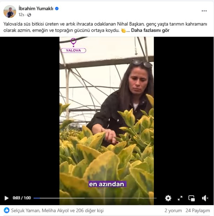 Tarım ve Orman Bakanı İbrahim Yumaklı, Yalova'da süs bitkileri üreten Tarım Orman Gençlik Konseyi Üyesi Nihal Başkan hakkında sosyal medya hesabından videolu paylaşımda bulundu.