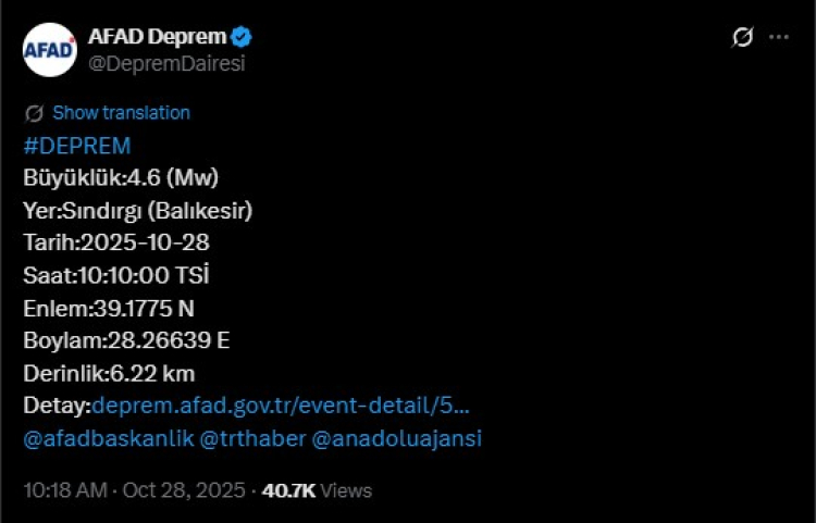 AFAD verilerine göre, Balıkesir’in Sındırgı ilçesinde bugün saat 10:10’da 4,6 büyüklüğünde bir deprem daha meydana geldi. Depremin derinliği 6,22 km olarak belirlendi. Deprem Yalova'da şiddetli şekilde hissedildi.