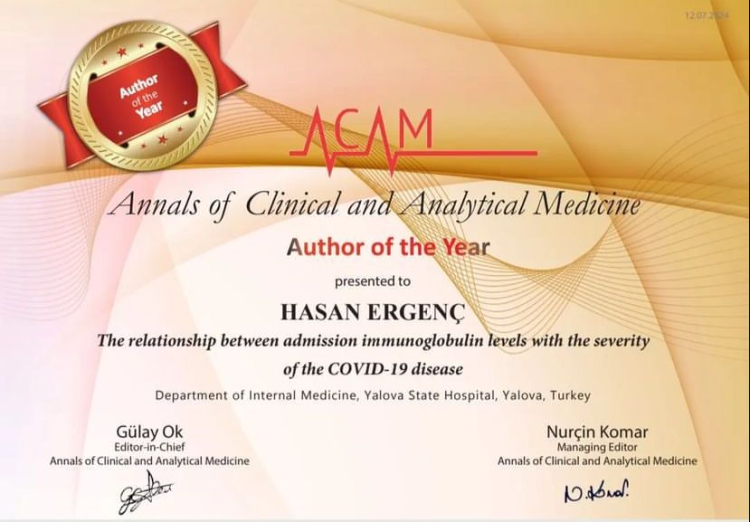 Yalova Eğitim ve Araştırma Hastanesi Başhekimi Doç. Dr. Hasan Ergenç, sağlık alanındaki katkılarıyla; sağlık bilimleri ve tıbbın tüm alanlarıyla ilgili uluslararası düzeydeki bilimsel ve klinik değeri yüksek konular hakkında sayılar yayınlayan Annals of Clinical and Analytical Medicene (ACAM) Dergisi tarafından yılın yazarı olarak seçildi. Hastaneye kabuldeki immünglobilin düzeyleri ile Covid-19 hastalığının şiddeti arasındaki ilişki konusunda yılın yazarı olarak seçilen Yalova Eğitim ve Araştırma Hastanesi Başhekimi Doç. Dr. Hasan Ergenç, yapmış olduğu paylaşımda kendisine gönderilen mesajı yayınladı. Ergenç’e gelen mesajda, “Tıp bilimine katkılarınızdan dolayı Bayrakol MP Ödülü'ne layık görüldüğünüzü sizlere bildirmekten mutluluk duyuyoruz” ifadeleri yer aldı.