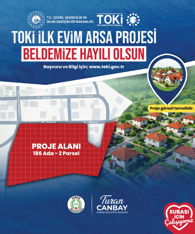 Müjdeli haberi sosyal medya hesabından duyuran Subaşı Belediye Başkanı Turan Canbay, “Kıymetli hemşehrilerim beldemiz adına önemli bir adımı daha sizlerle paylaşmanın mutluluğunu yaşıyoruz. Çevre Şehircilik ve İklim Değişikliği Bakanlığı ve TOKİ iş birliğiyle hayata geçirilen İlk Evim Arsa Projesi kapsamında, beldemize kazandırılacak yeni yaşam alanımız hepimize hayırlı olsun. Proje alanımız 186 ada, 2 parsel üzerinde yer almaktadır. Bu proje ile vatandaşlarımızın kendi evlerini kurabilecekleri, planlı ve modern bir yaşam alanı oluşturması hedeflenmektedir” ifadelerini kullandı.
