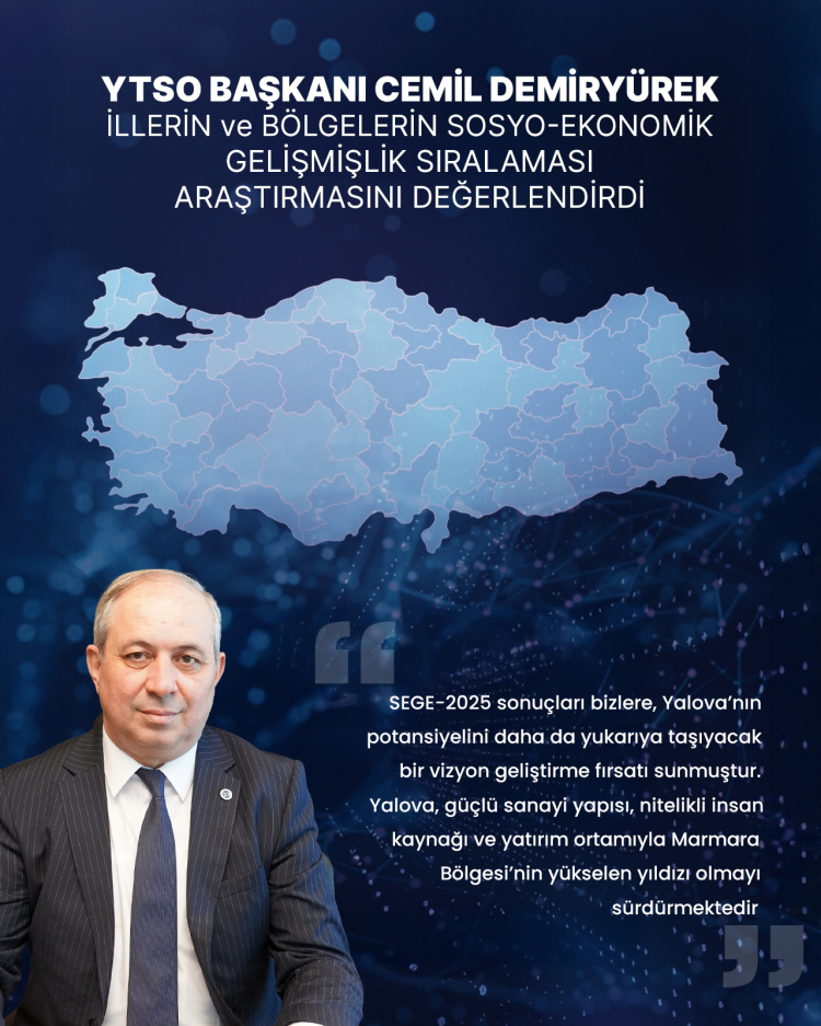 Sanayi ve Teknoloji Bakanlığı tarafından yayımlanan İllerin Sosyo-Ekonomik Gelişmişlik Sıralaması (SEGE-2025) raporu, Türkiye’nin kalkınma haritasını ortaya koyarken illerin ekonomik, sosyal ve yapısal gelişmişlik düzeylerini kapsamlı bir şekilde değerlendirdi. YTSO Başkanı Cemil Demiryürek, rapora göre Yalova’nın 81 il arasında 9. sırada yer alarak Türkiye’nin en gelişmiş 10 ili arasına girdiğini söyledi.