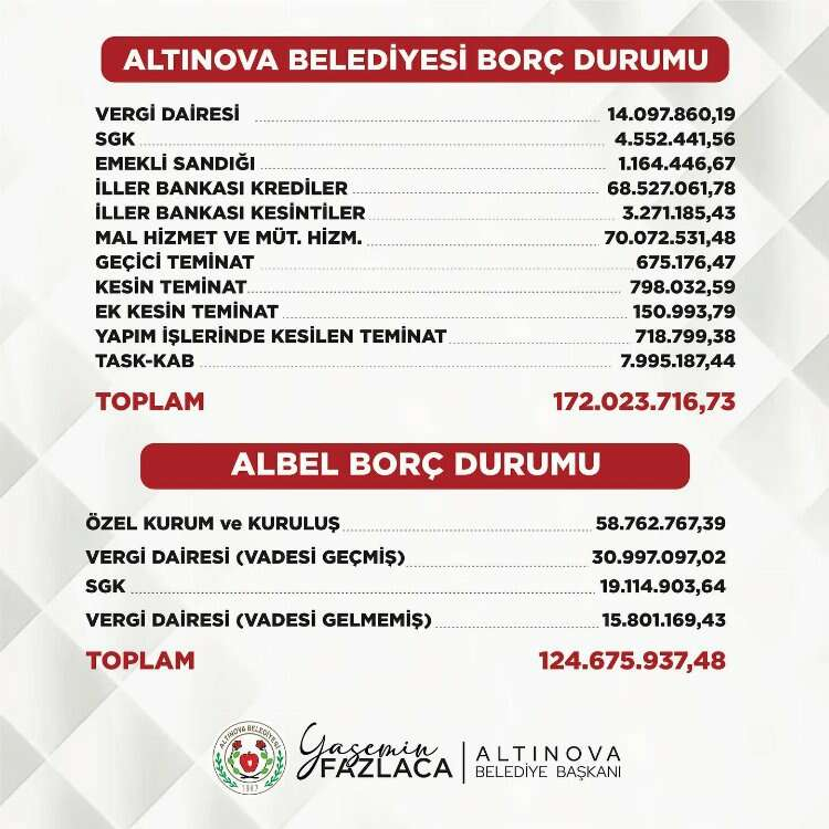 Altınova Belediye Başkanı Yasemin Fazlaca, Altınova Belediyesinin güncel borç listesini yayınladı.