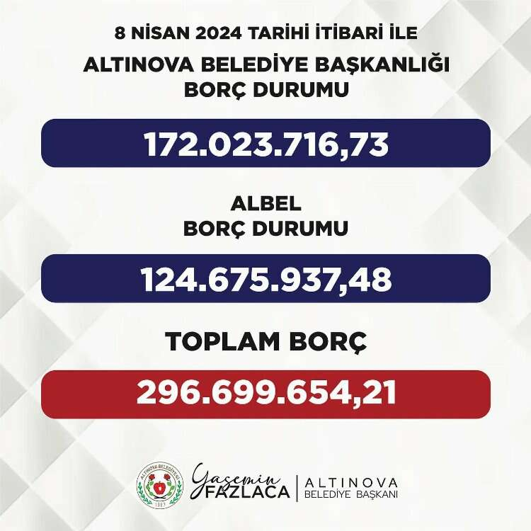 8 Nisan 2024 Tarihi İtibari İle Altınova Belediye Başkanlığının borcu: 172 milyon 23 bin 716,73 TL.